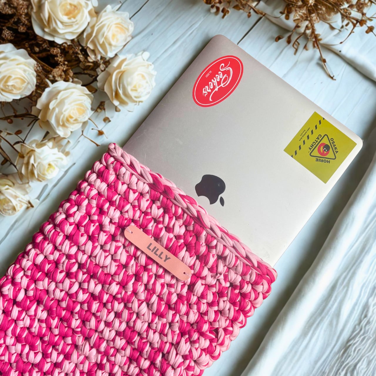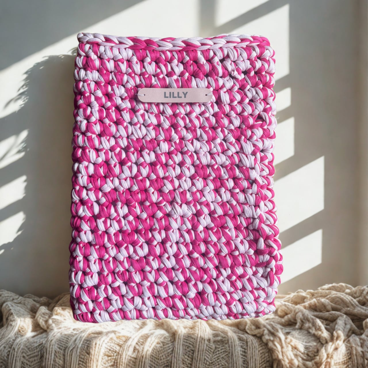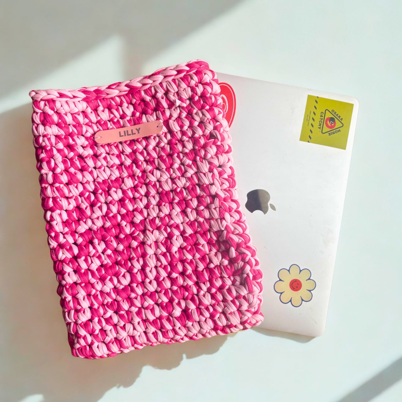 このPCケースは、柔らかいTシャツヤーンを使用しており、Lサイズのデバイスにぴったり